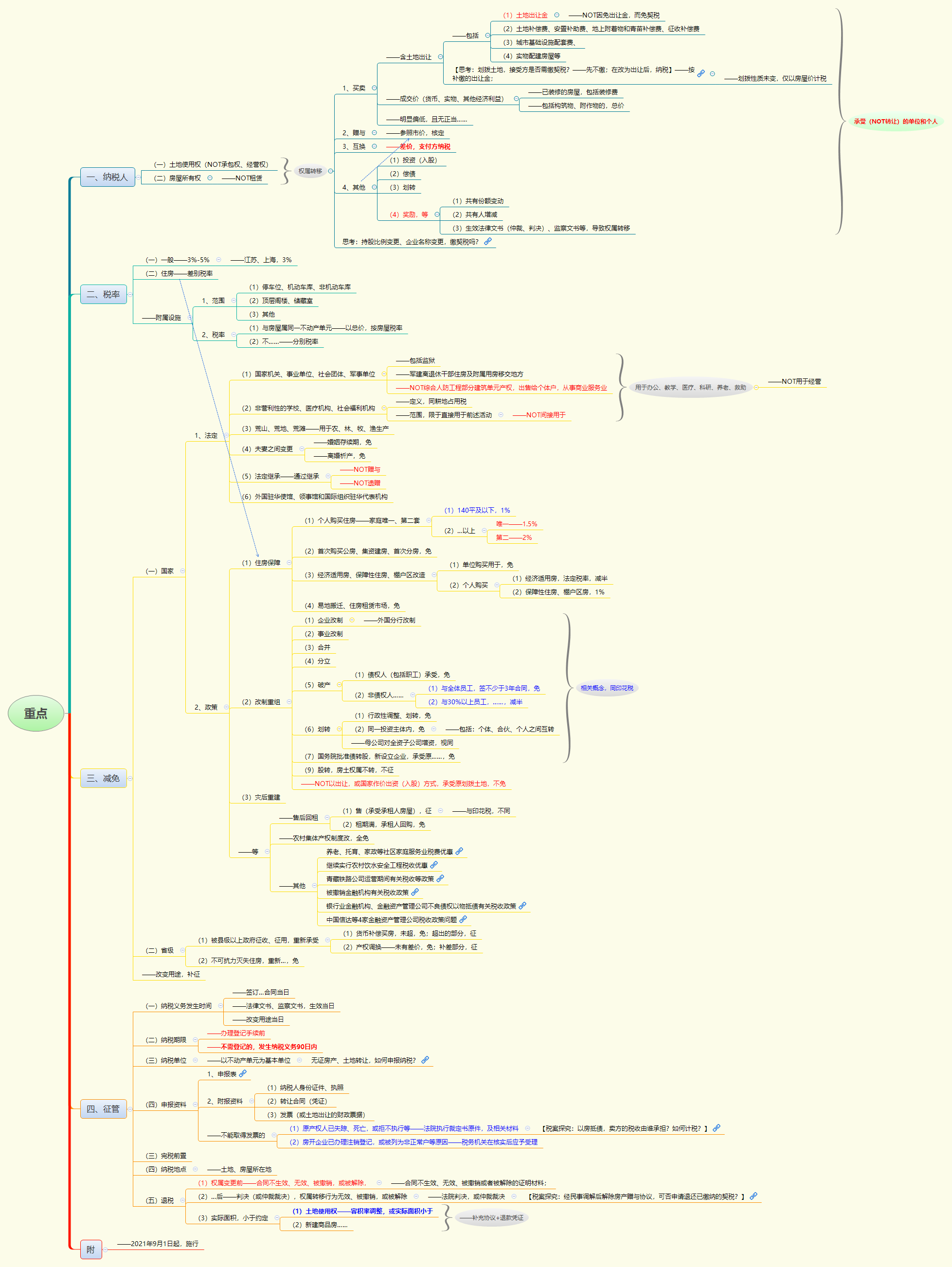 知识点:(1)土地房屋权属;(2)转移(涉:①土地使用权出让;②免征土地出让金出让国有土地使用权征收契税问题;③土地使用权转让,知识点出售、赠与、互换;④不知识点土地承包经营权、土地经营权;房屋买卖、赠与、互换;⑤以作价投资(入股)、偿还债务、划转、奖励等方式转移土地、房屋权属);(3)承受方应缴纳契税的特定情形(涉:①共有不动产份额变化;②共有人增加或者减少;③人民法院、仲裁委员会的生效法律文书或者监察机关出具的监察文书等因素,发生土地、房屋权属转移);