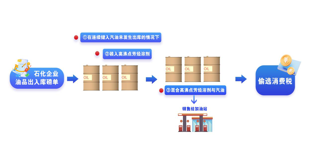 至此,宏坚石化的逃税手法“一览无余”:该企业作为经销企业,从上游采购敏感化工品,在无生产资质的情况下,直接将这些原料注入储罐进行物理混合,产出所谓的“汽油”进行销售,规避其作为油品调和者应承担的消费税纳税义务,达到偷逃税款的目的。