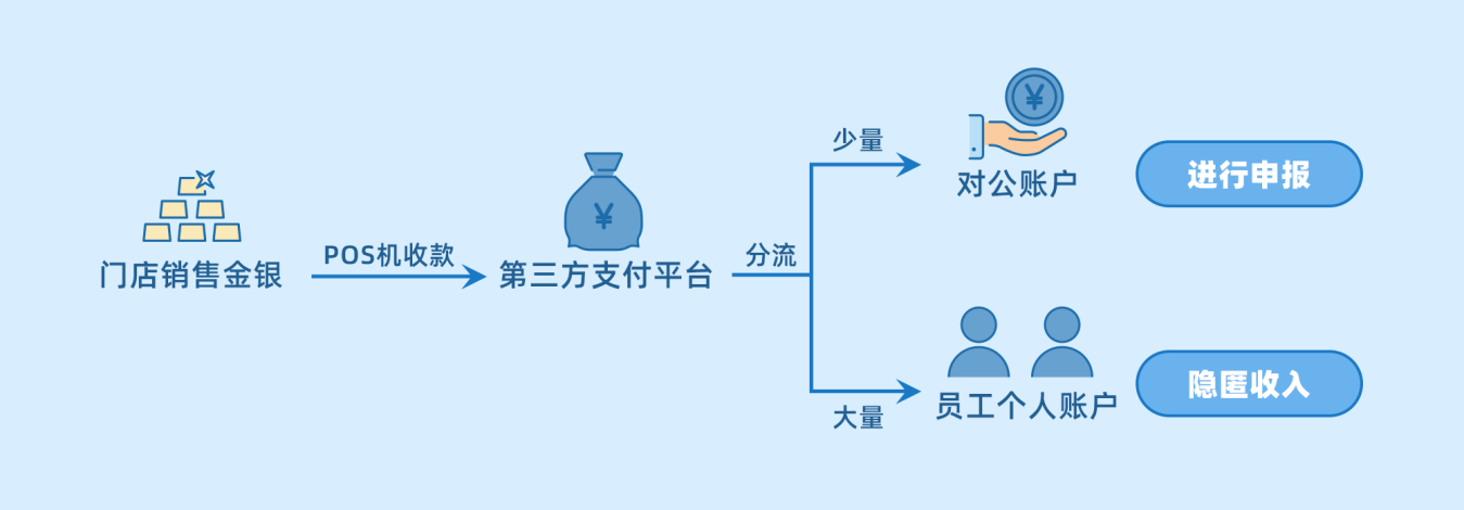 经查实,两家公司共在第三方支付平台上登记了3个商户号,除对公账户有收款外,另外两个商户号均为垦泰商贸两家成都分公司的员工的个人账户,收款金额较对公账户更为巨大。检查人员随即依法约谈了两名员工,两人均承认账户收款资金实际为公司销售金银饰品取得的销售货款。