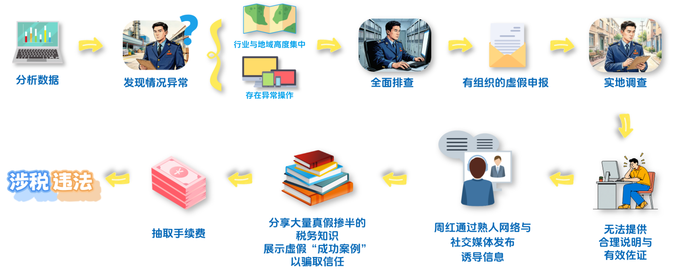 随着调查深入,检查组依法全面调取了涉案人员与周静之间的通讯记录、资金往来等信息。通过对周静微信交易记录中的2万个交易对象、3万余条交易数据交叉比对分析,最终锁定了关键证据,完整还原了一个以“帮忙退税,能帮你多退一点”的虚假填报骗取个人所得税退税案件操作模式: